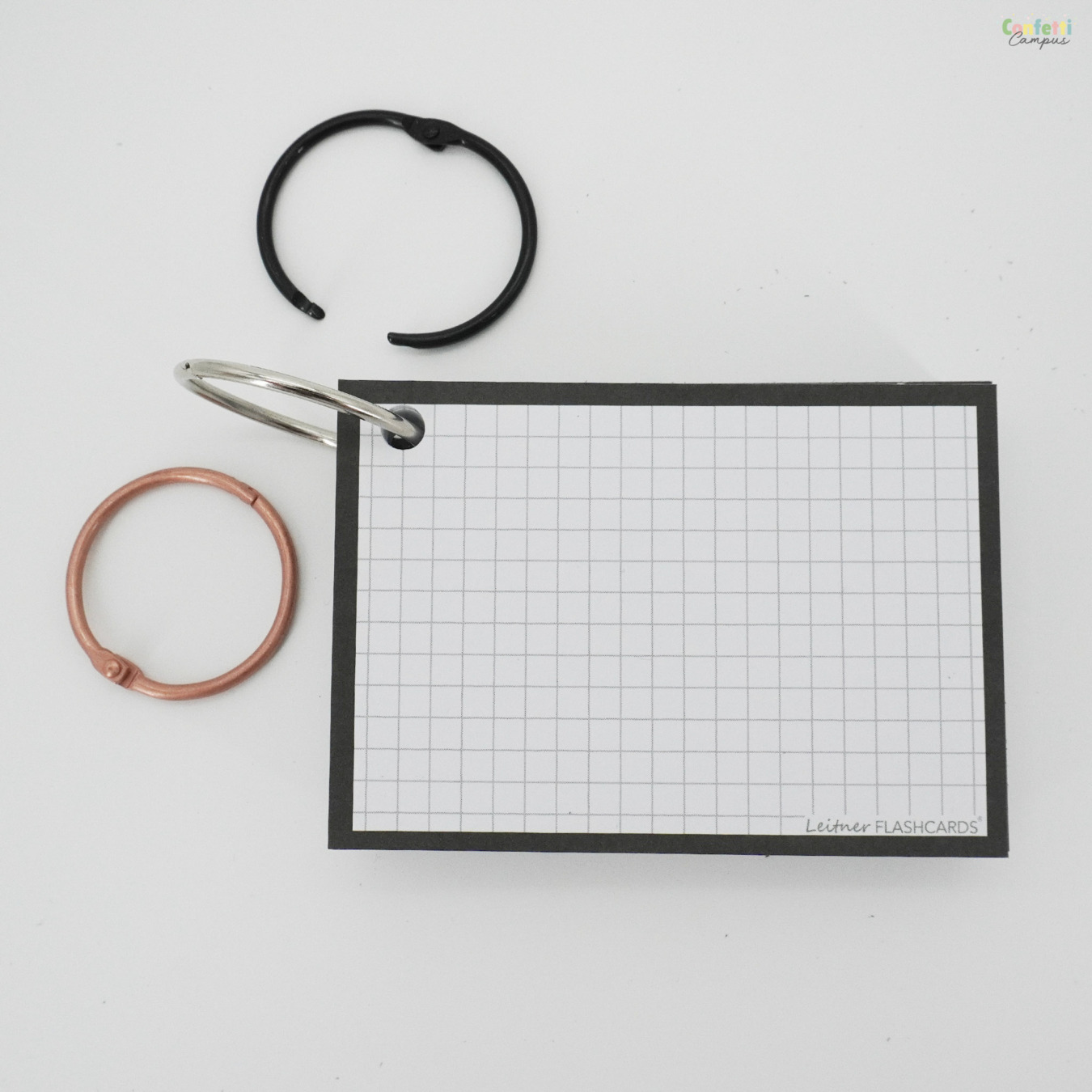 Optionnel: Les flashcards peuvent être "perforées" sur demande. Ajoute à cela un anneau à fermoir et tes cartes mémoire seront ainsi maintenues entre elles et sécurisées. Regroupe-les par thème, examen ou matière. Elles sont également plus faciles à transporter. Pratique pour réviser dans le bus, le tramway ou en voiture. L'anneau fourni est fabriqué en métal solide et possède un fermoir à clic très pratique, facile à ouvrir. Chaque anneau peut rassembler jusqu'à 100 flashcards. Disponibles à l'unité, les flashcards peuvent également être commandées en plus grandes quantités ou combinées avec d'autres produits, à prix réduit, via nos offres à la carte. Elles sont emballées de manière écologique et envoyées par la poste en format lettre ou colis en fonction de leur nombre.