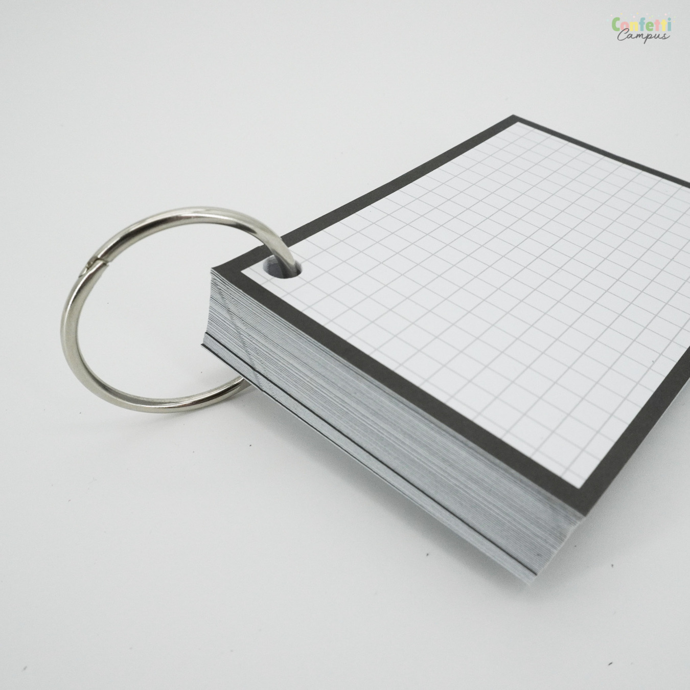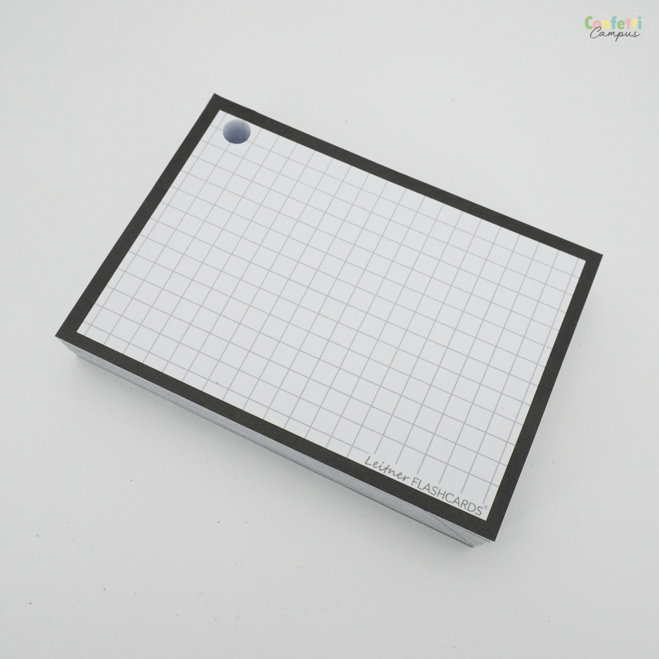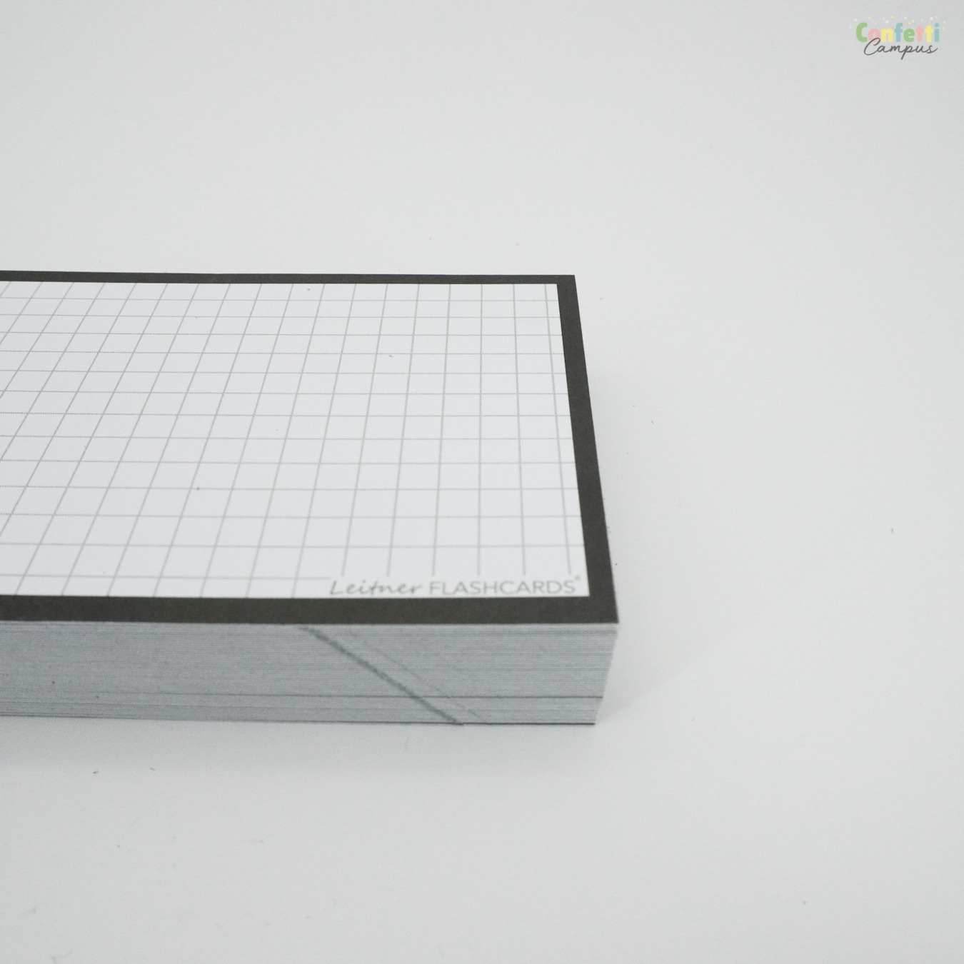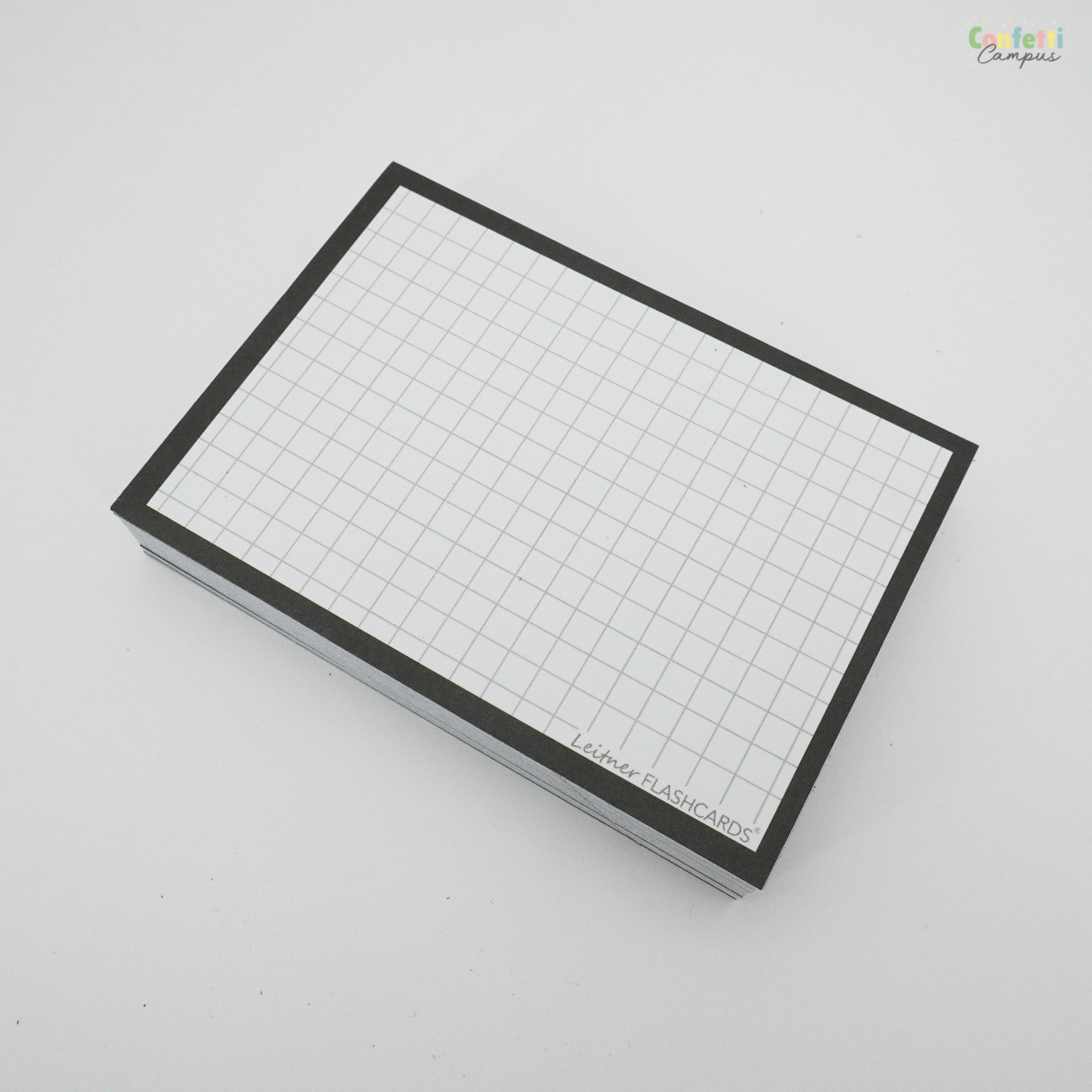 Pack de 50 Flashcards Leitner® ou cartes mémoire, à petits carreaux 5x5mm, au format A7. Bordure noire.