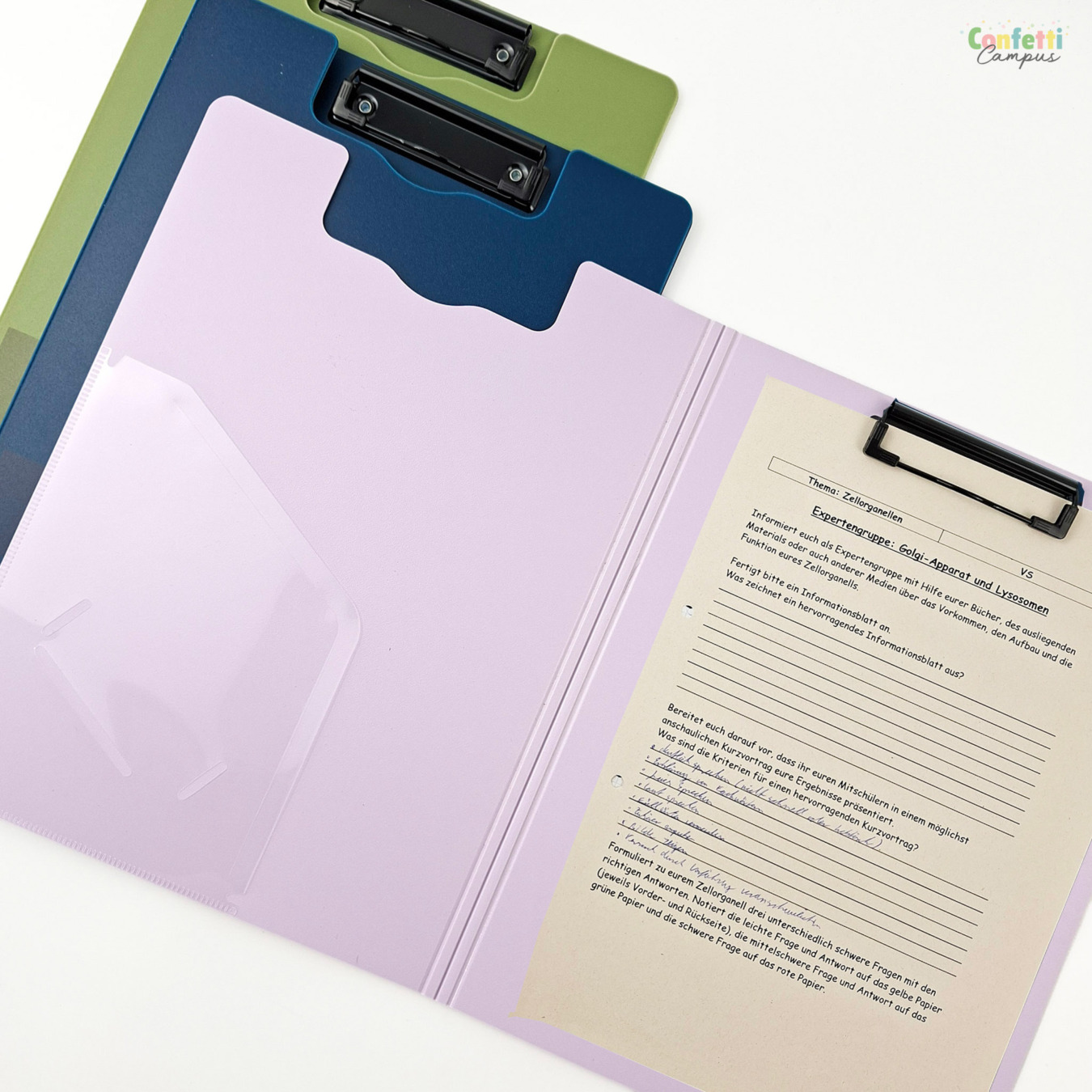 Grâce à sa pince métallique sécurisée, tes feuilles restent bien en place, et sa couverture rigide à rabat les protège une fois le cours terminé.