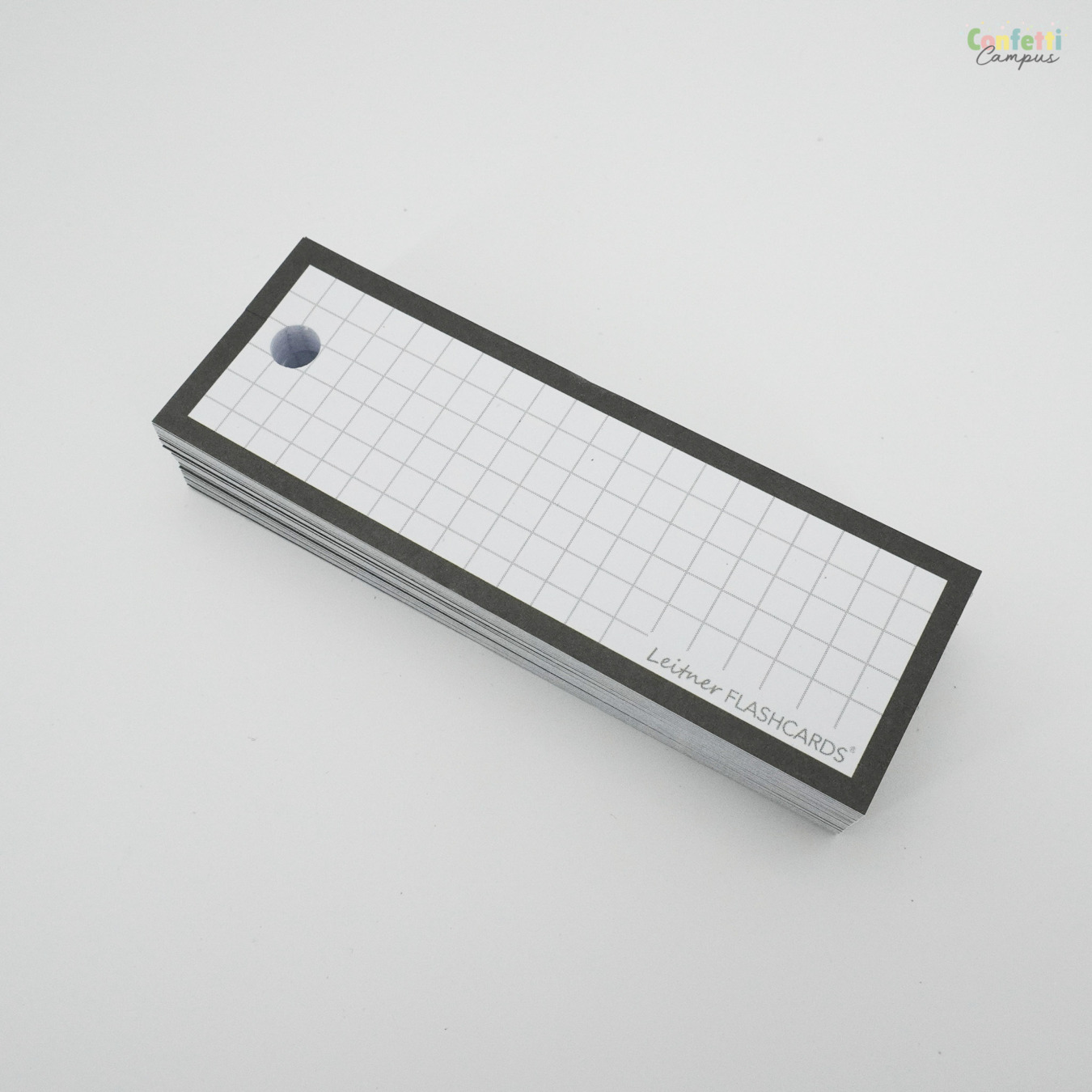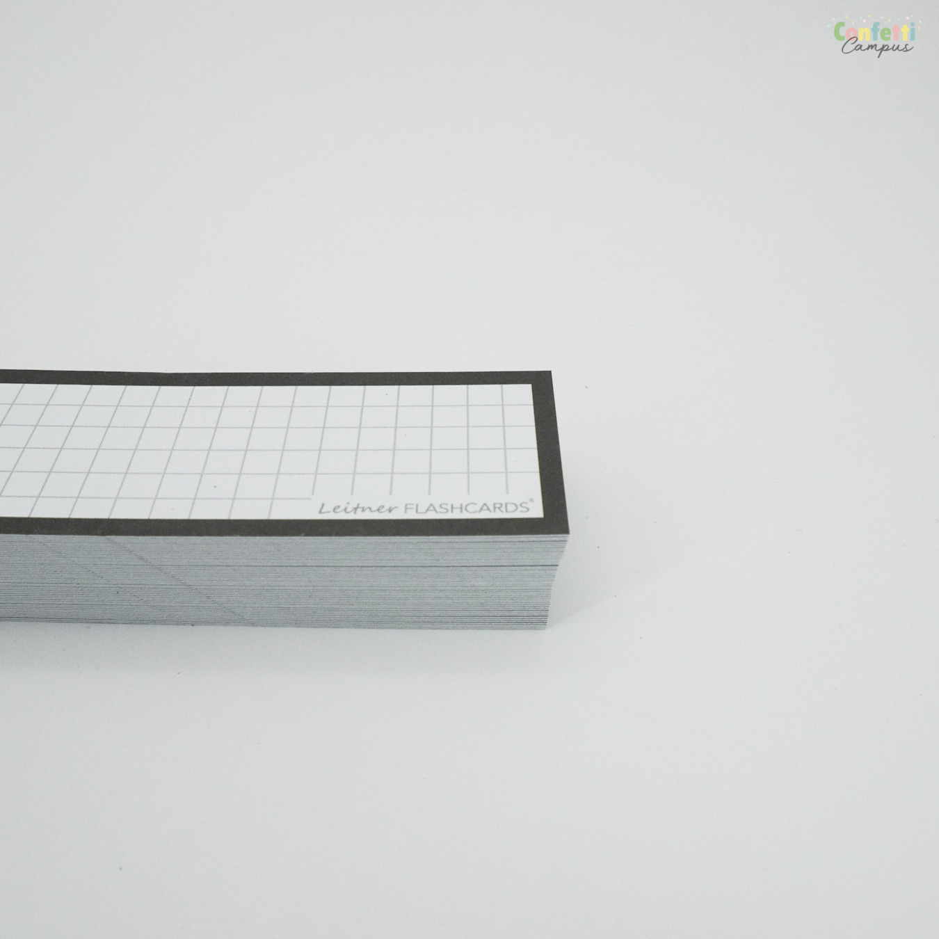 Pack de 50 Flashcards Leitner® Vocabulaire ou cartes de mots, à petits carreaux 5x5mm, petit format 3,5x10,5cm. Bordure noire.
