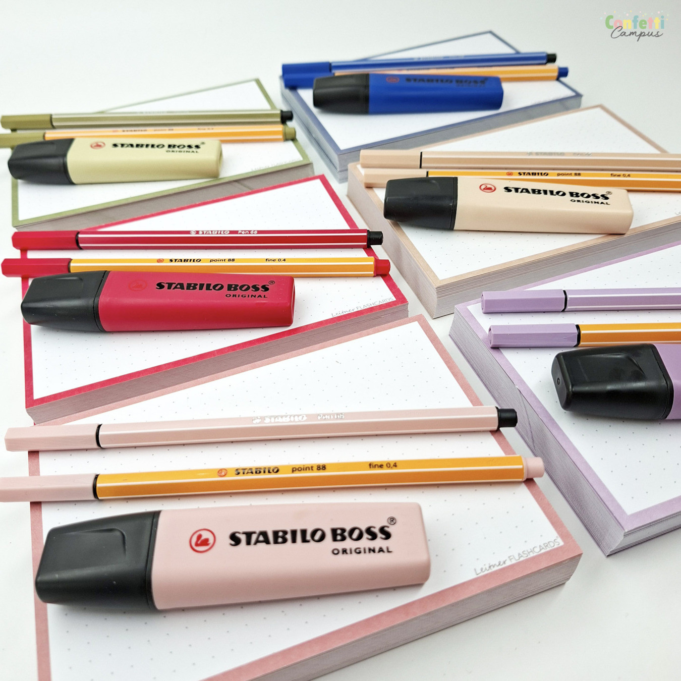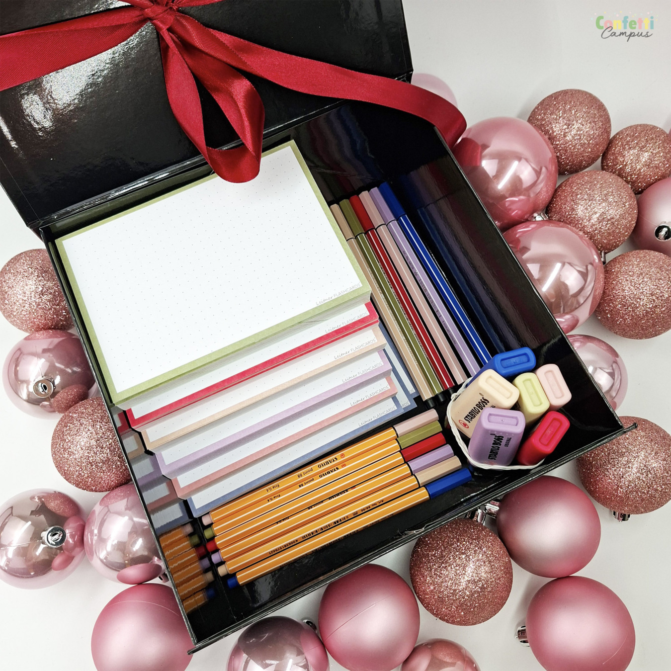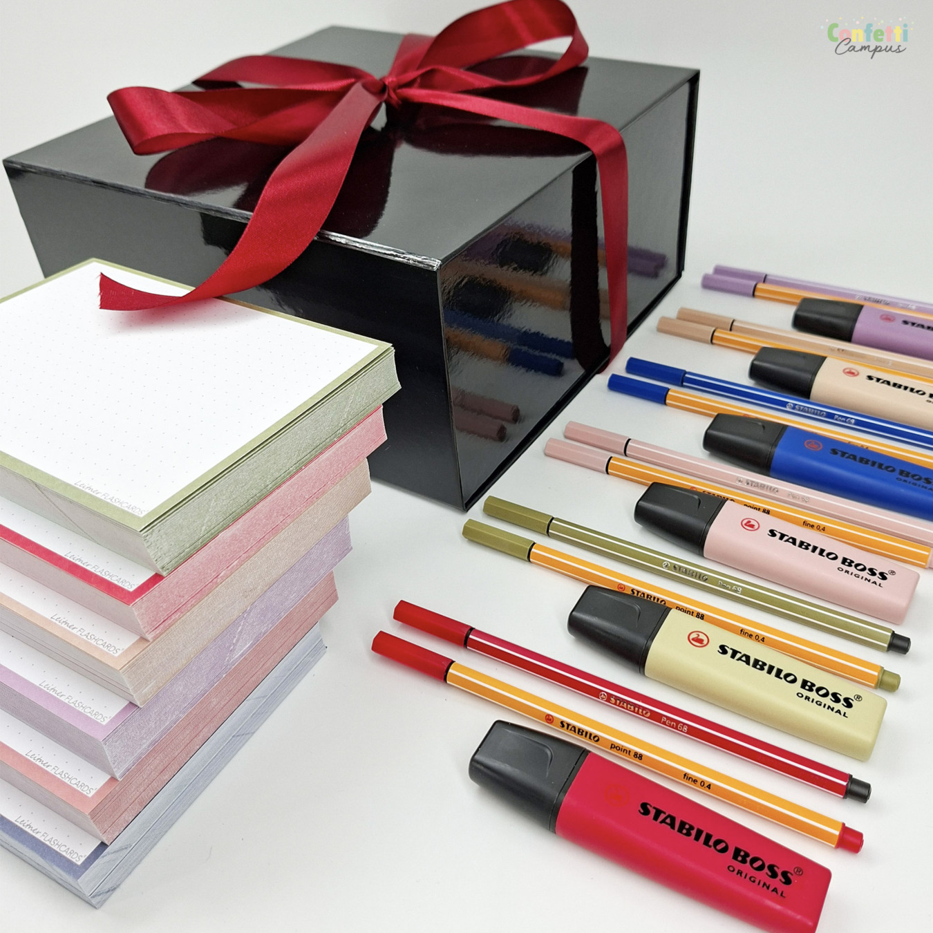 Coffret cadeau Etudiant comprenant 300 fiches bristol Leitner format A5 (15x21cm) ou A6 (10,5x15cm) ainsi qu'un kit d'écriture assorti pour créer les plus jolies fiches de révisions: 6 stylos-feutres fins Stabilo point 88 + 6 feutres de dessin Stabilo pen 68 + 6 surligneurs Stabilo Boss Wildflower et NatureColours. Le tout dans une magnifique boite cadeau noire, élégante à fermeture magnétique, entourée d'un joli ruban satin. Chaque article de cette composition est à prix réduit: -15%