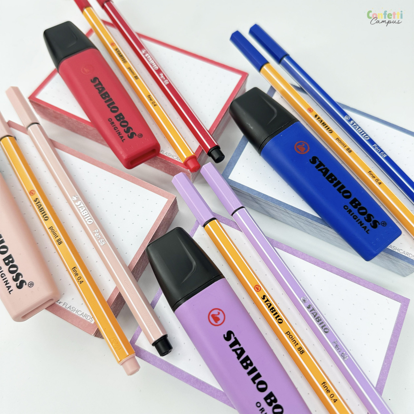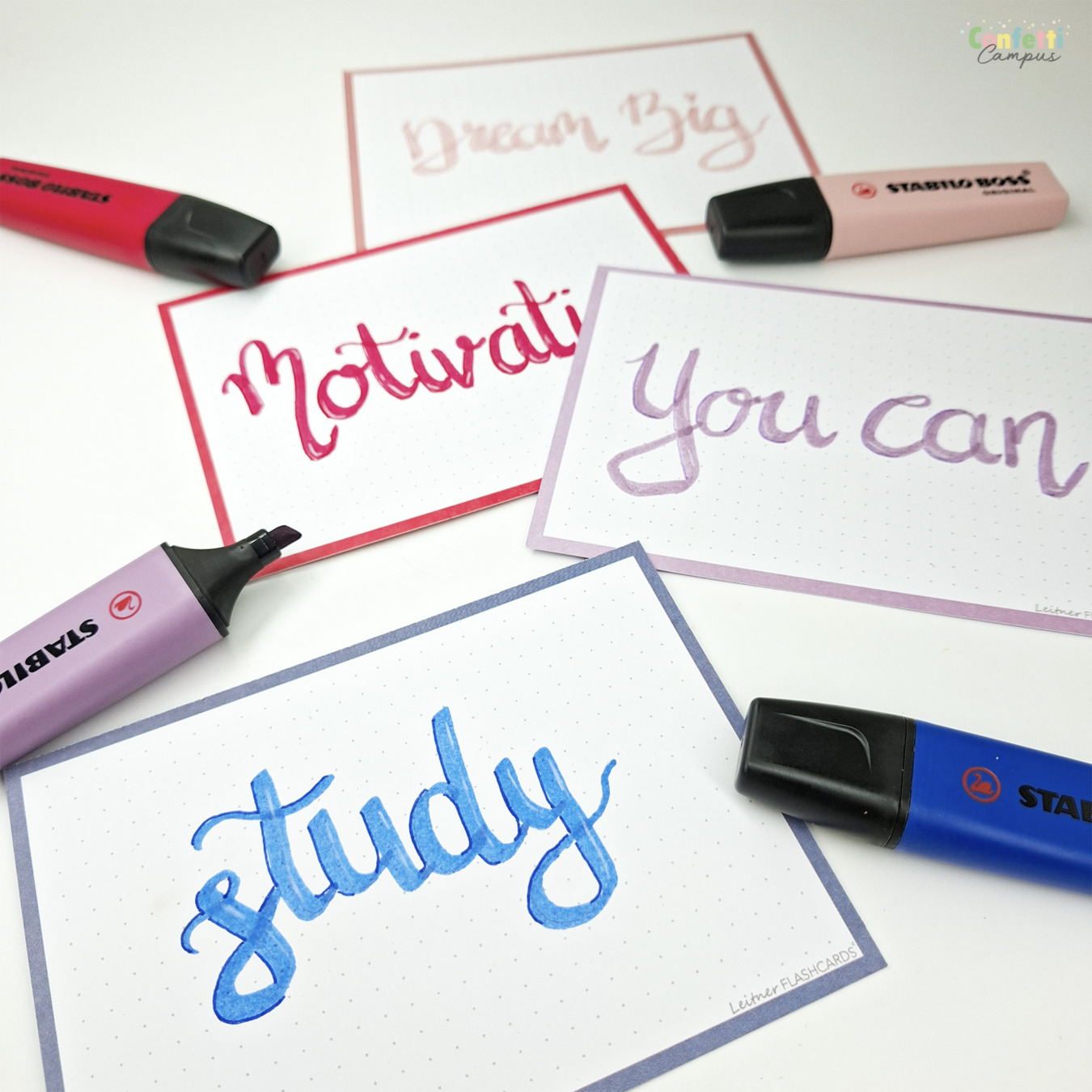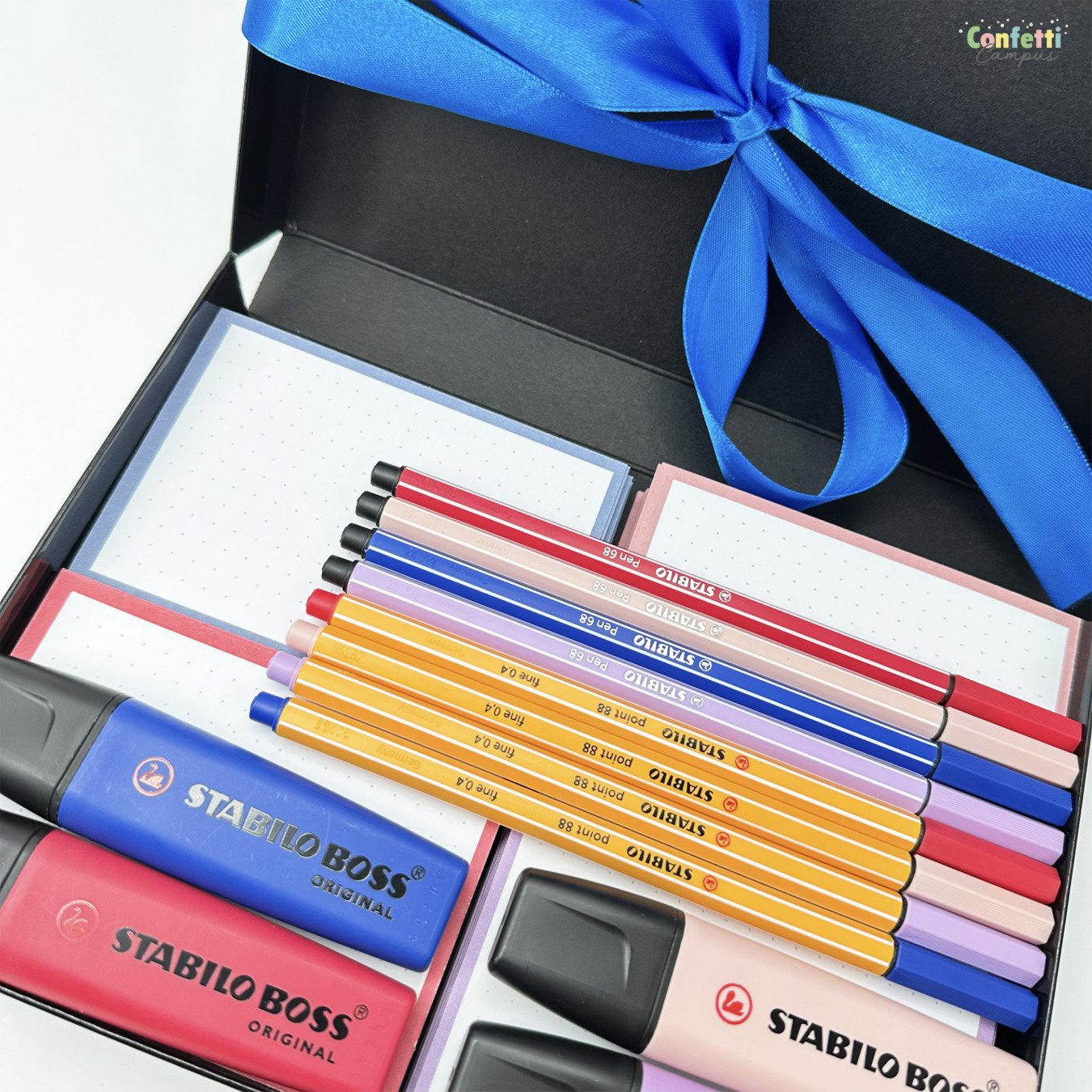 Coffret cadeau spécial études et révisions avec 250 flashcards Leitner (4 packs A7) et kit d'écriture assorti. Un vrai bouquet de couleurs pour booster ta motivation et donner du style à tes flashcards: ce coffret cadeau rassemble les plus belles teintes de la nouvelle collection "Fleurs sauvages" (Wildflower) de Stabilo avec 4 surligneurs Stabilo Boss Original Wildflower + 4 stylos-feutres fins Stabilo point 88 et 4 feutres de dessin Stabilo pen 68 assortis; le tout emballé dans une boite cadeau A5 noire, élégante, entourée d'un joli ruban satin.