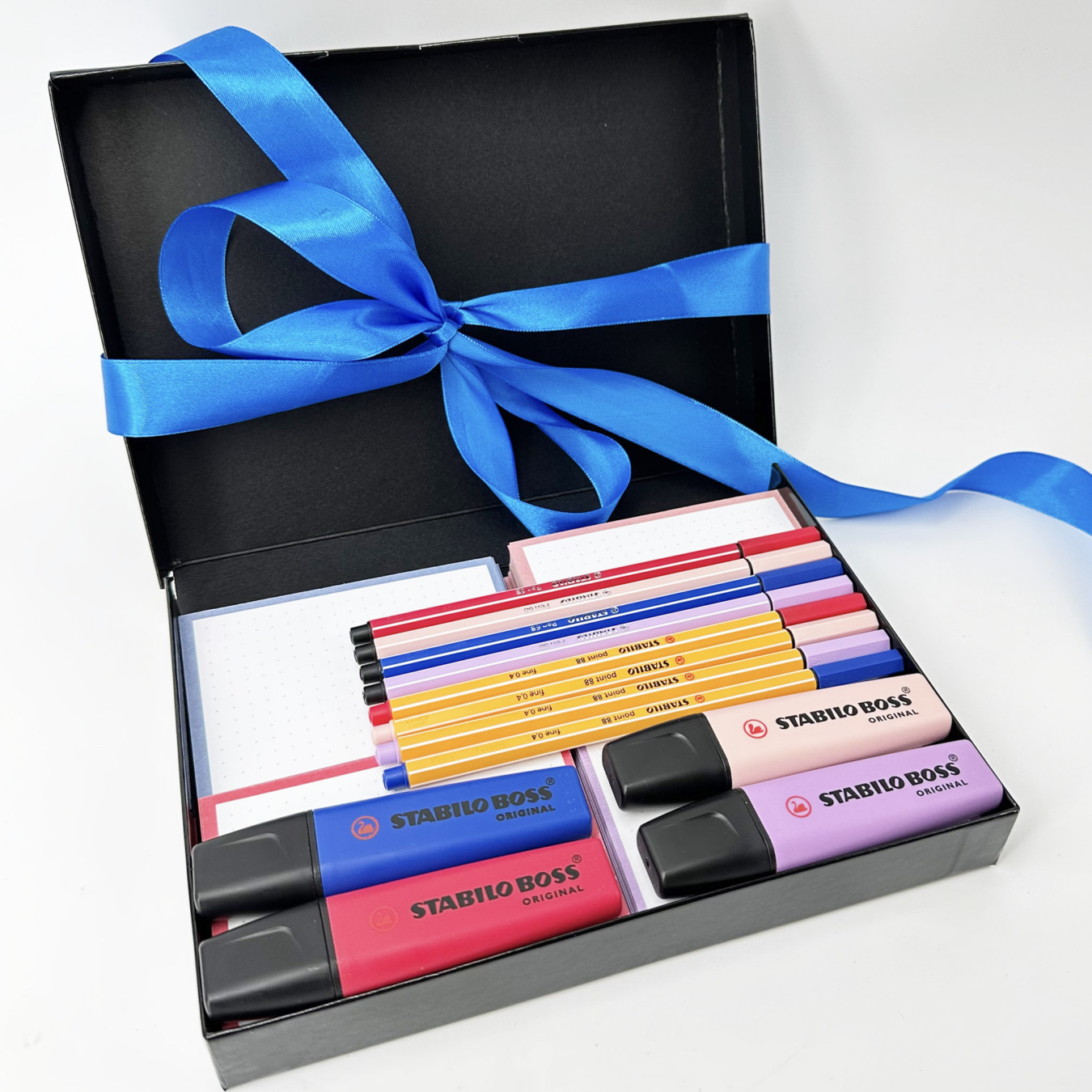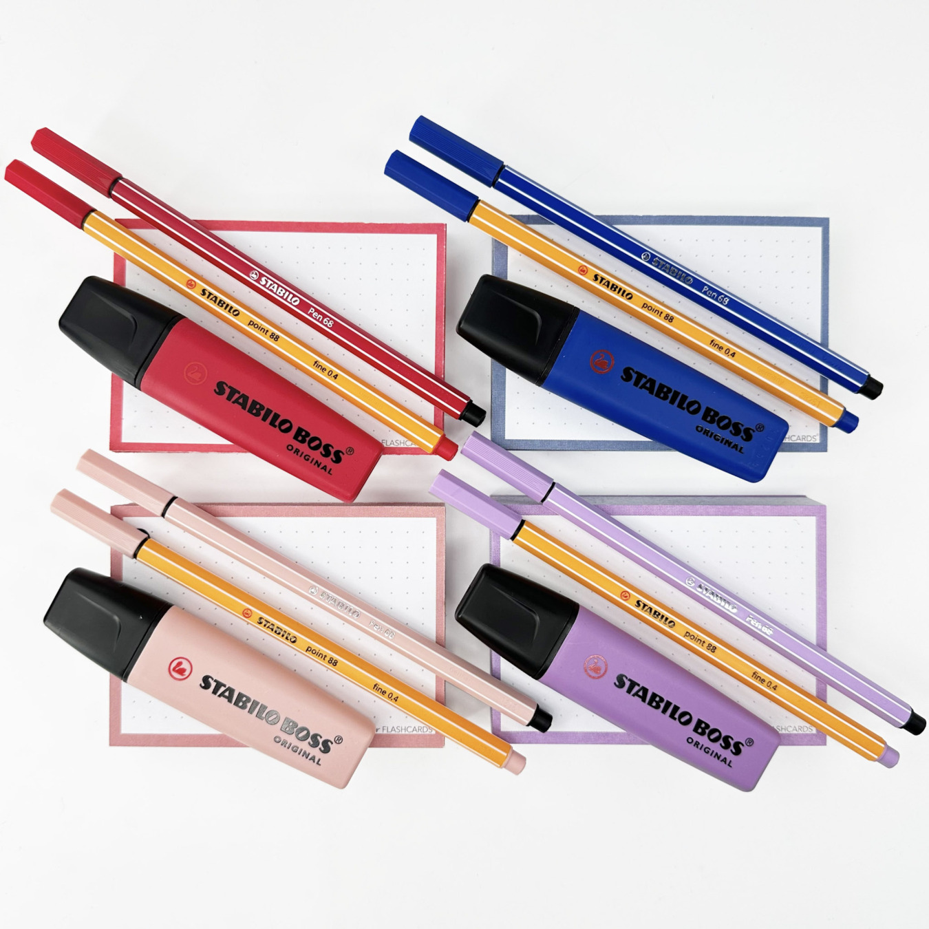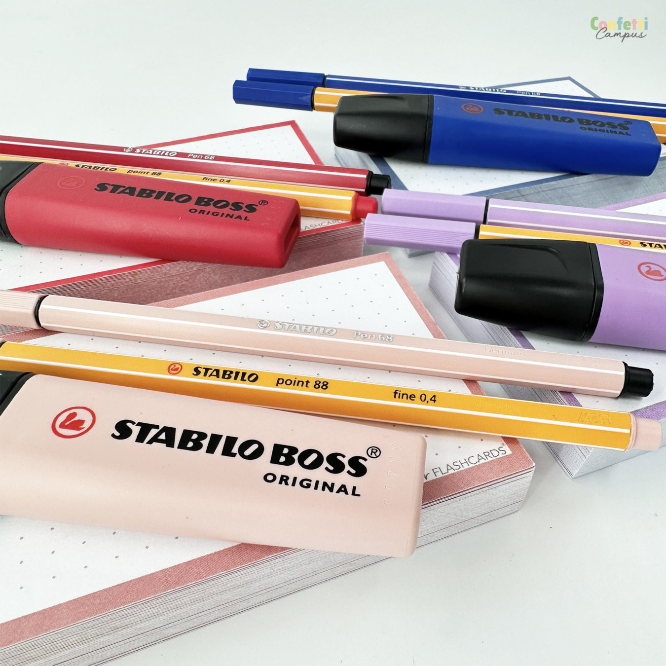 Coffret cadeau spécial études et révisions avec 250 flashcards Leitner (4 packs A7) et kit d'écriture assorti. Un vrai bouquet de couleurs pour booster ta motivation et donner du style à tes flashcards: ce coffret cadeau rassemble les plus belles teintes de la nouvelle collection "Fleurs sauvages" (Wildflower) de Stabilo avec 4 surligneurs Stabilo Boss Original Wildflower + 4 stylos-feutres fins Stabilo point 88 et 4 feutres de dessin Stabilo pen 68 assortis; le tout emballé dans une boite cadeau A5 noire, élégante, entourée d'un joli ruban satin.