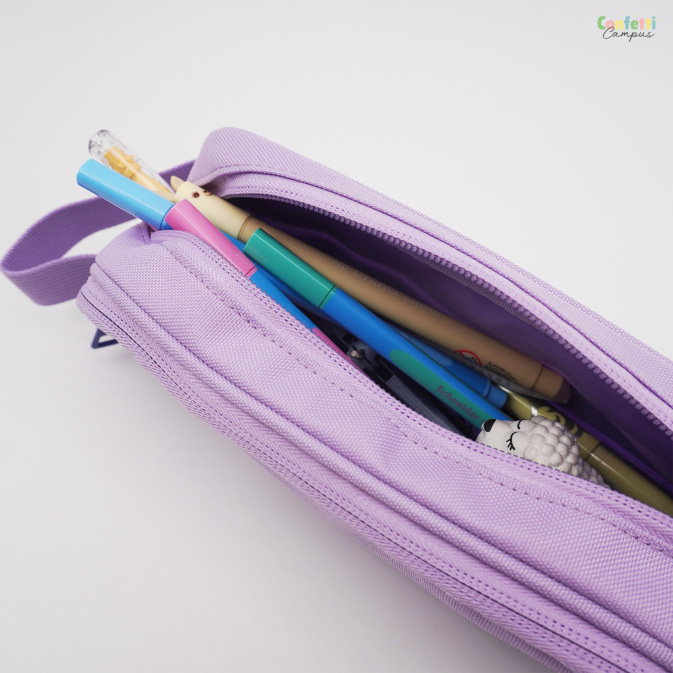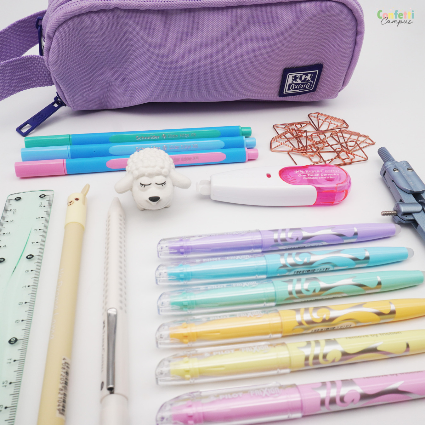 Une grande trousse OXFORD avec compartiments, pré-remplie avec stylos, surligneurs effaçables assortis dans les dégradés pastel et petites fournitures essentielles. #astucieux: la trousse s'attache à ton cahier, pour ne jamais l'égarer. N'hésite pas à composer ta propre trousse selon ton style et tes envies. -10% sur chaque article.