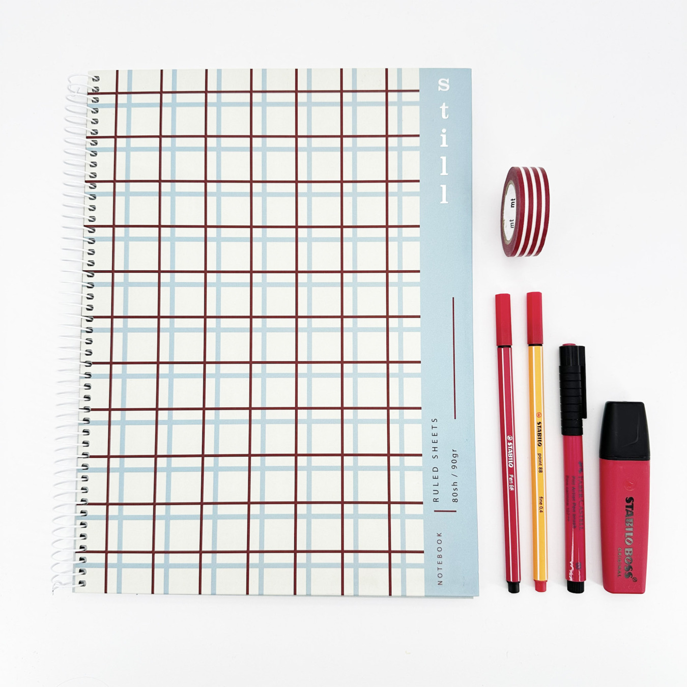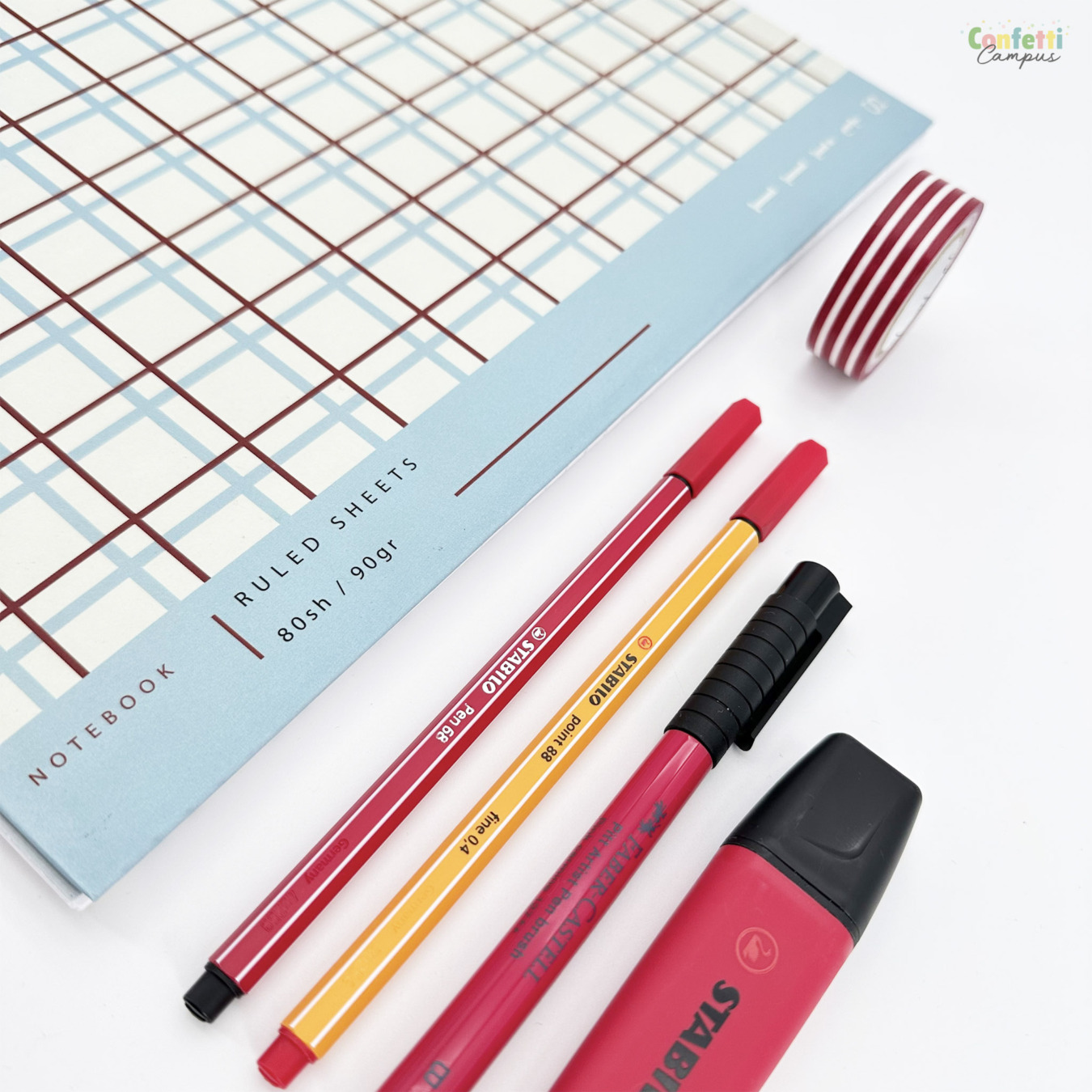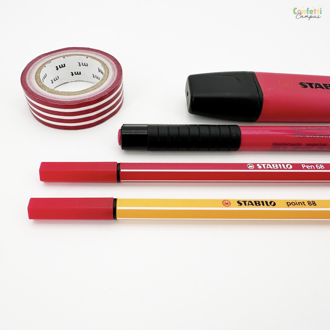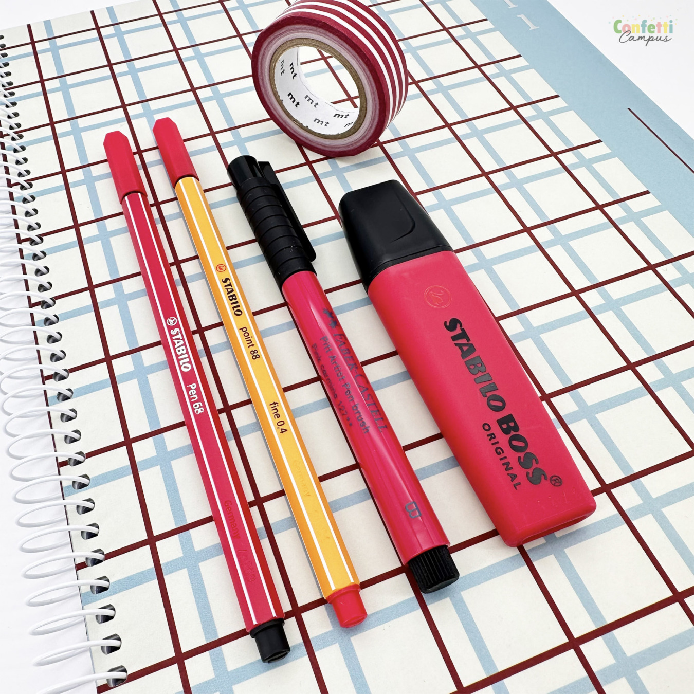 A chaque matière sa couleur ! kit d'écriture pré-selectionné pour prendre tes notes de cours dans les tons rouges: un stylo-feutre, un feutre, un feutre-pinceau pour de jolis titres, un surligneur et un rouleau de washi tape assorti | Kit entièrement personnalisable | -10% sur chaque article 🏷️