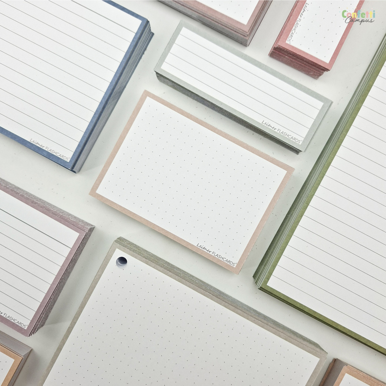 300 Flashcards Leitner, au format A7, décor(s) et couleur(s) pastel au choix. 6 packs de 50 cartes mémoire chacun, avec ou sans perforation et anneau