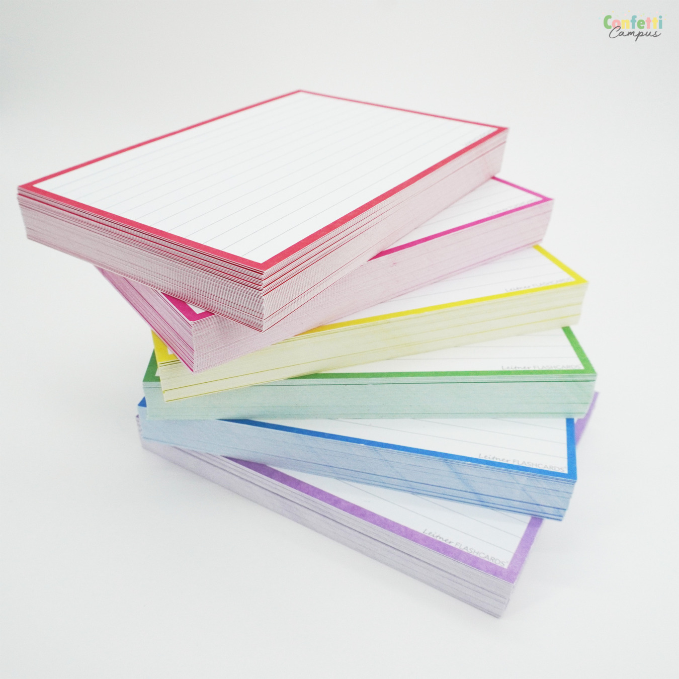 300 Flashcards Leitner, au format A7, décor(s) et couleur(s) neon au choix. 6 packs de 50 cartes mémoire chacun, avec ou sans perforation et anneau