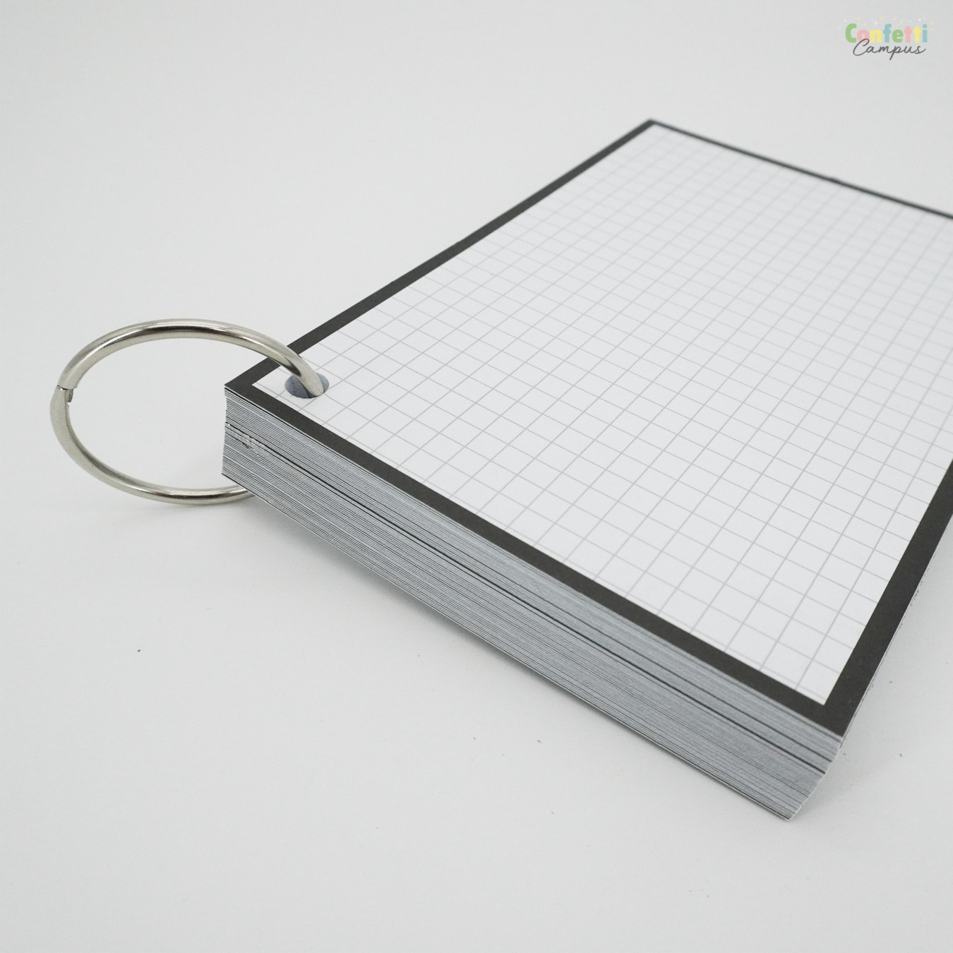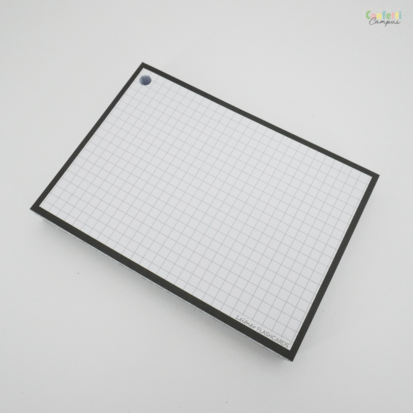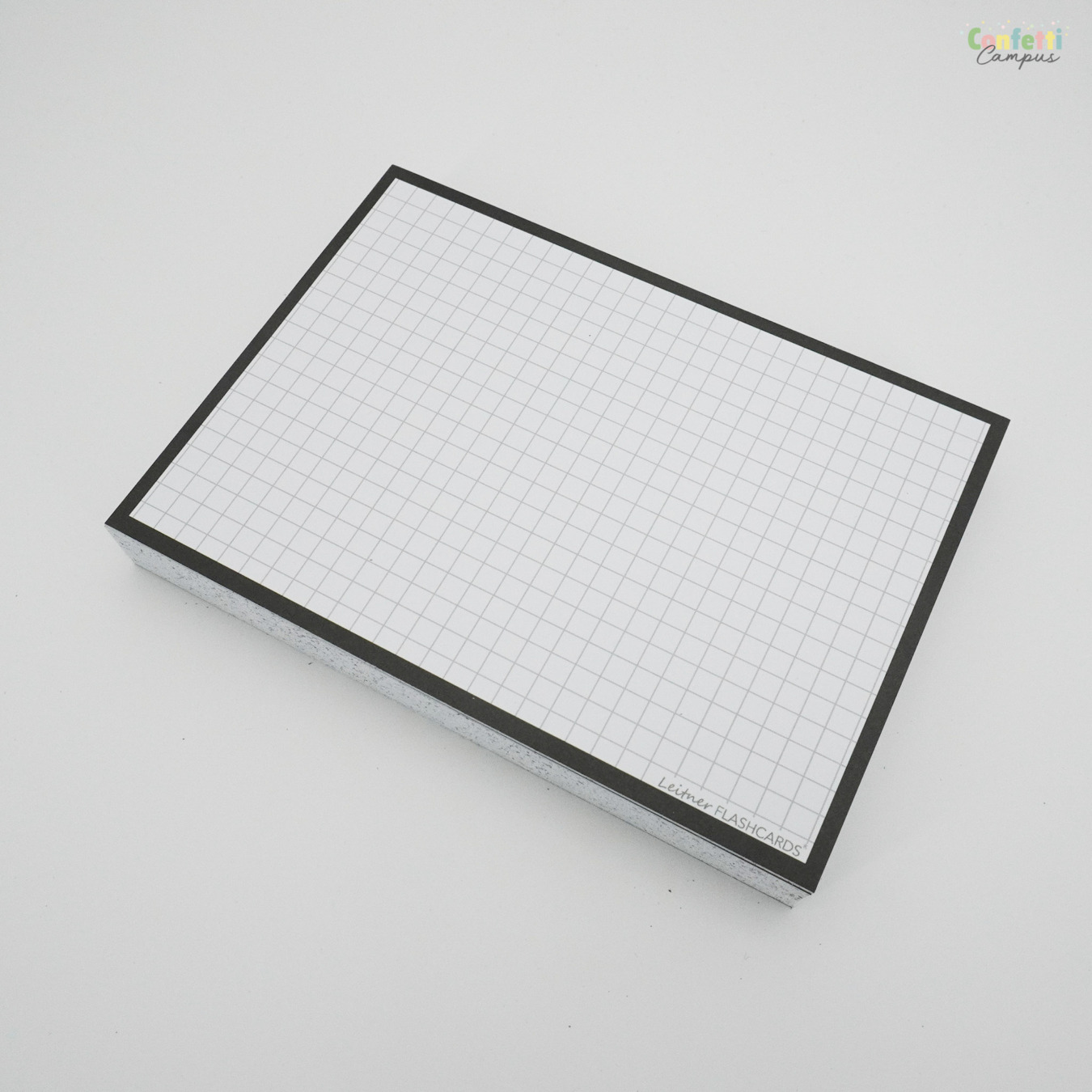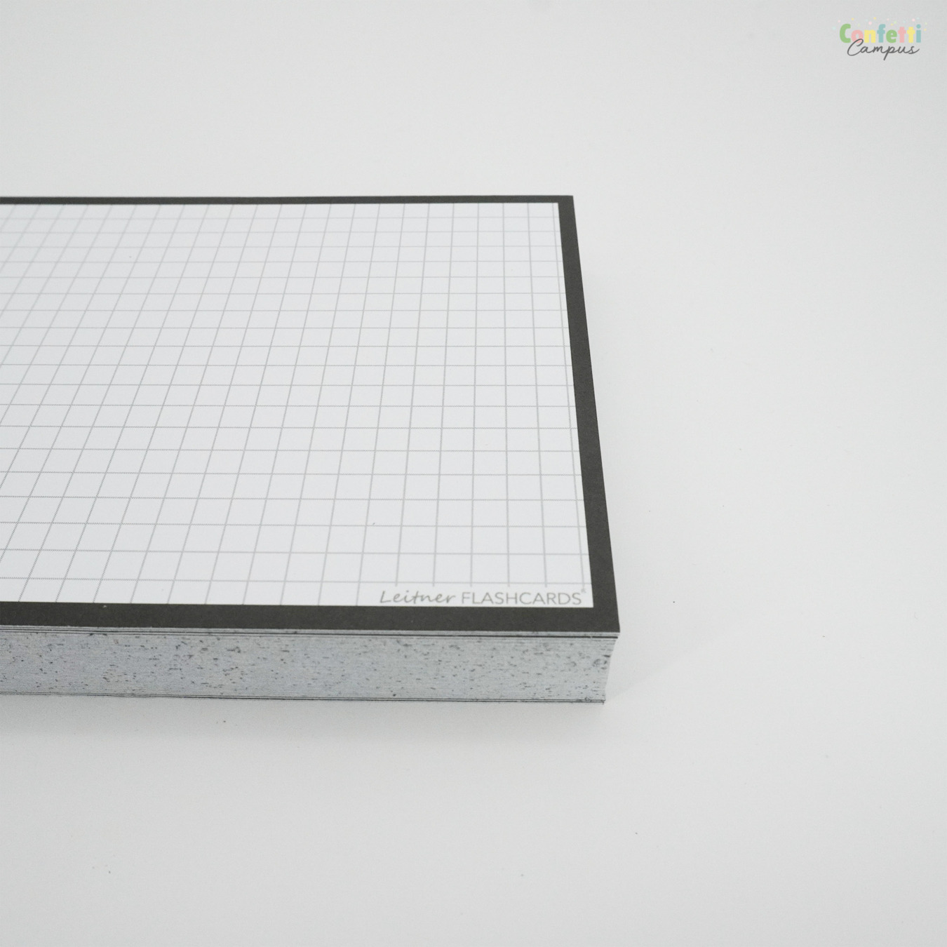 Pack de 50 Flashcards Leitner® ou cartes mémoire, à petits carreaux 5x5mm, au format A6. Bordure noire.