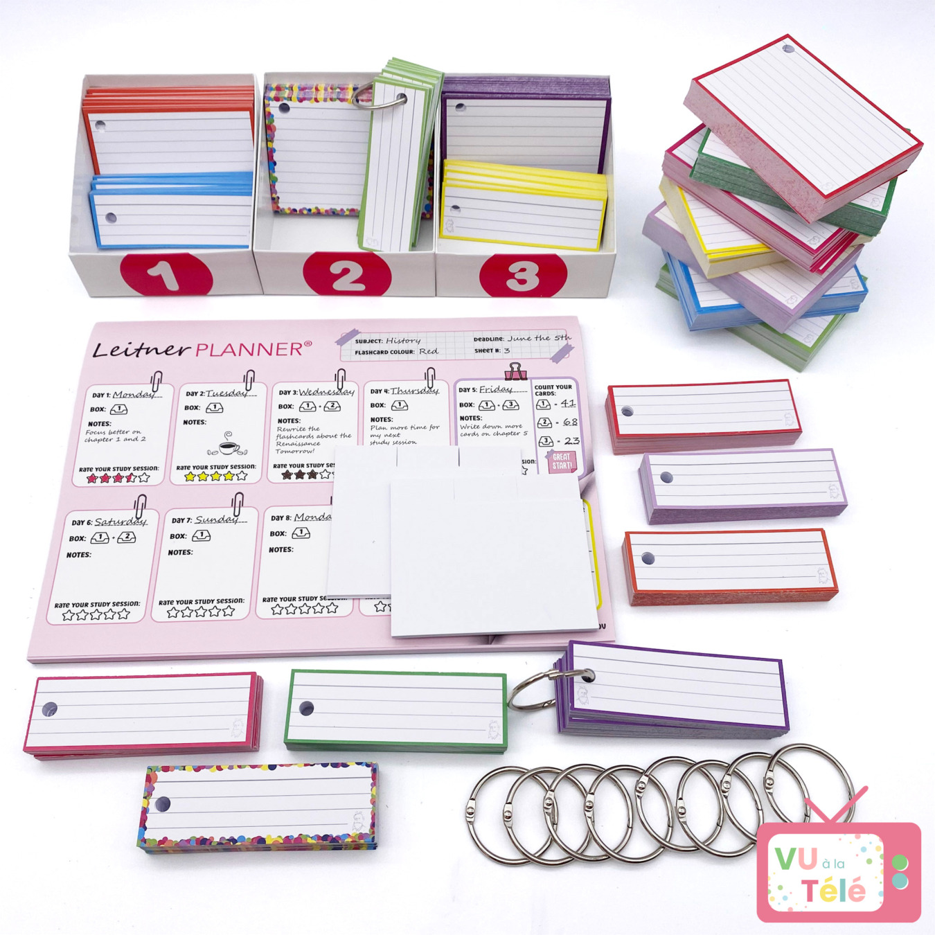 Les Flashcards Leitner® ou cartes mémoire sont de petites fiches de papier rigides, utilisées pour "flasher" ses cours, c'est à dire découper ses cours en informations courtes et précises. Les flashcards s'appuient sur une technique d'apprentissage éprouvée: la méthode Leitner. S'il est avéré que sans réactivation, nous oublions plus de la moitié des informations apprises au bout d'un jour (courbe de l'oubli), il est pourtant assez facile d'ancrer ces informations dans sa mémoire à long terme, en les "réactivant" c'est à dire en les révisant plusieurs fois, à intervalle régulier. La méthode Leitner s'appuie sur ce principe de répétition espacée et fait en sorte que chaque jour, tu n'apprennes que ce que tu ne connais pas encore. Tu révises les cartes mémoire que tu connais de manière plus espacée, tous les 3 ou 5 jours seulement.