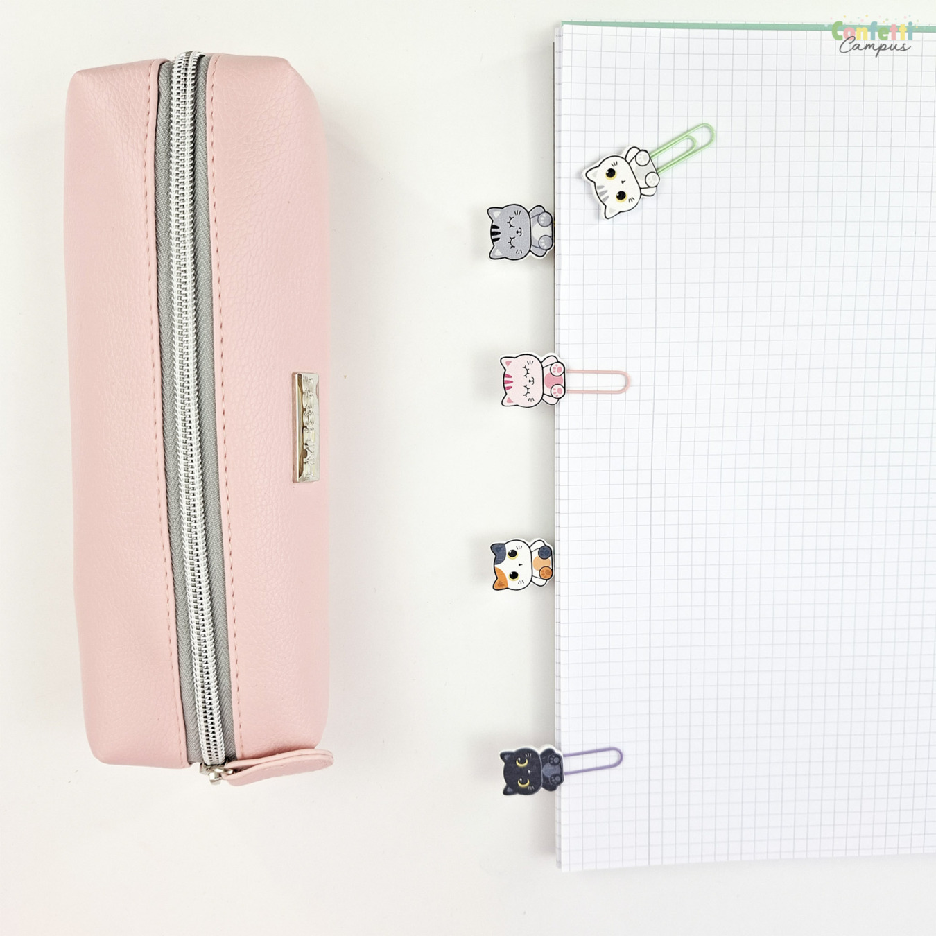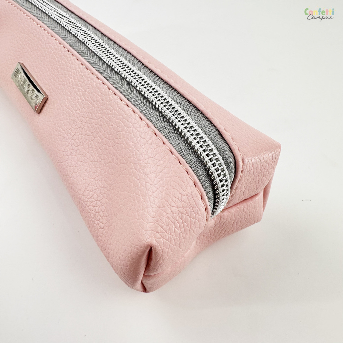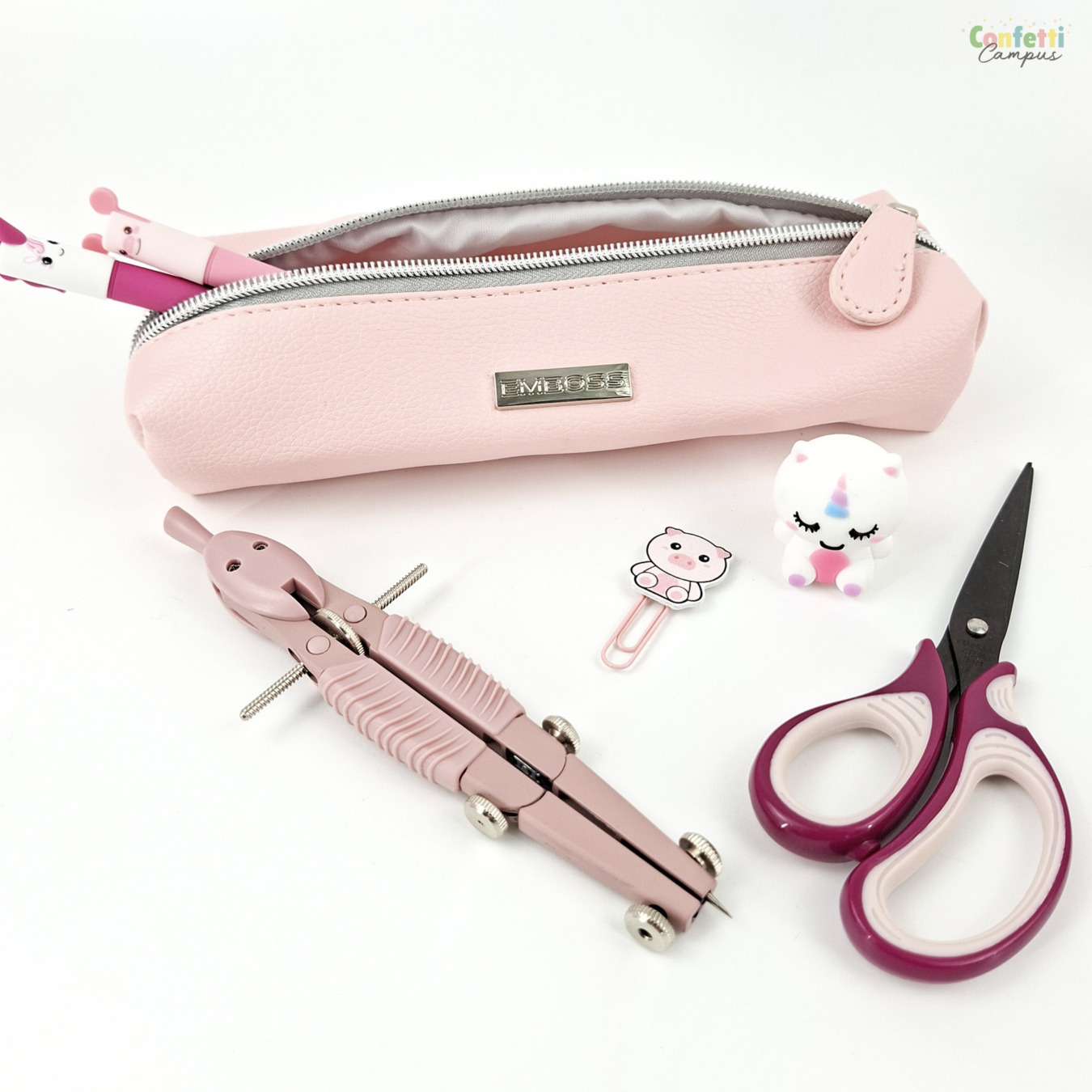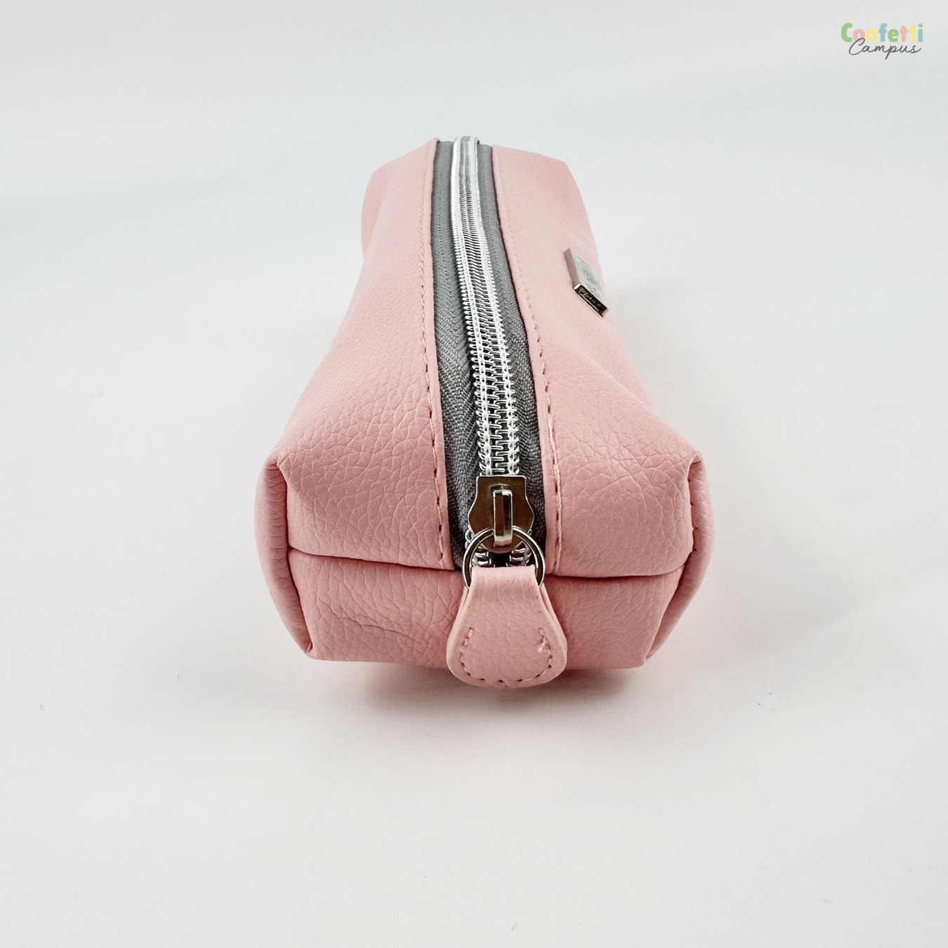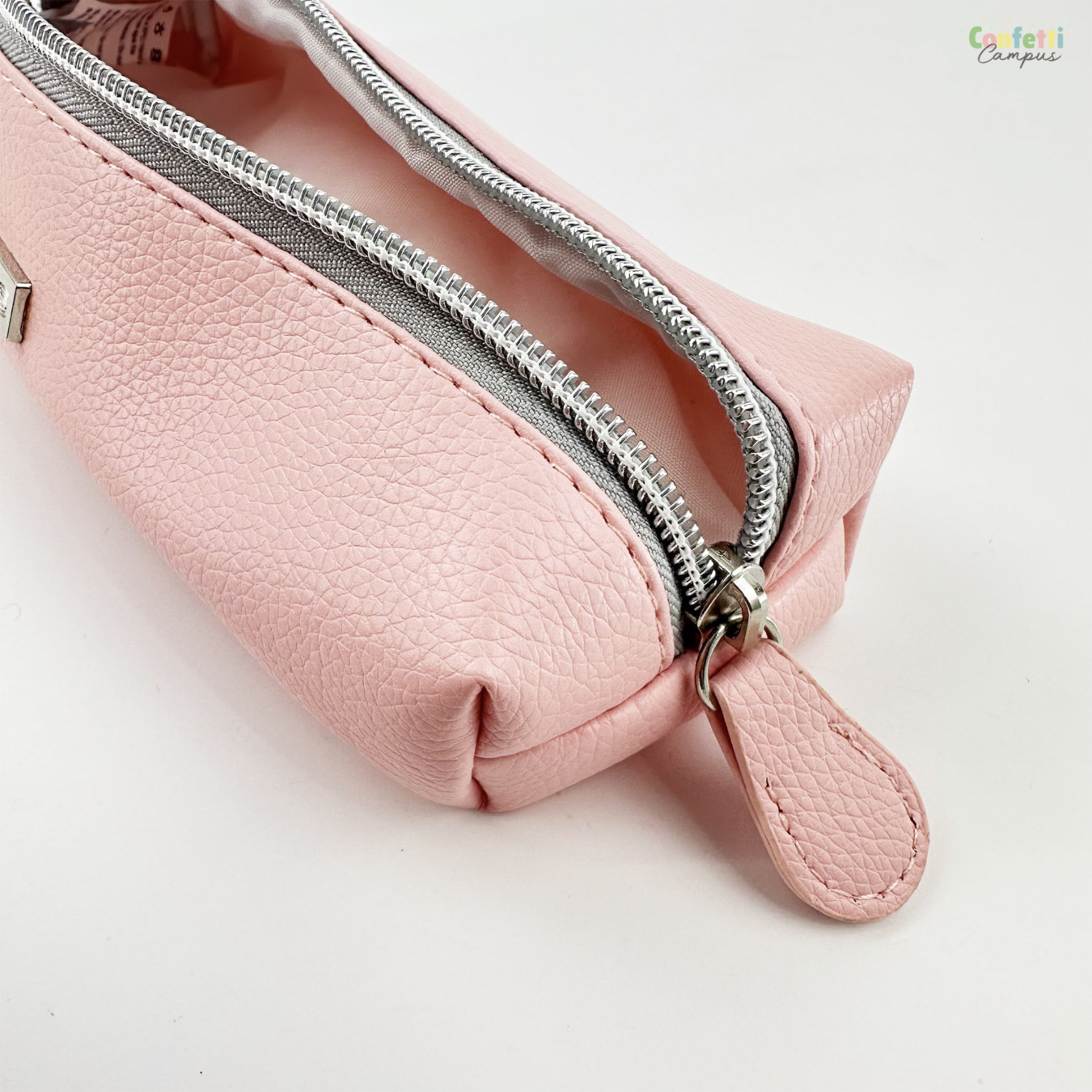 - Fermeture éclair métallique et languette en tissu assorti à la couleur de la trousse à stylos.